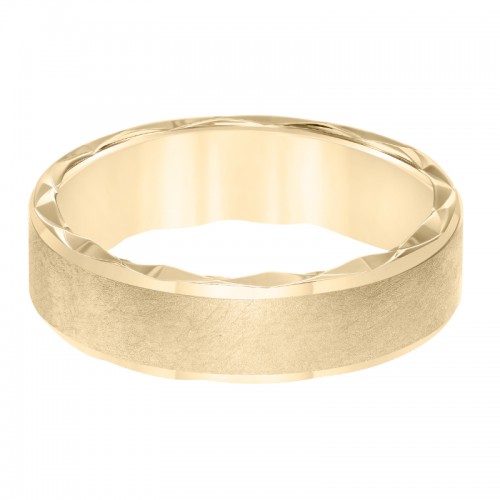 Men s wedding band with ultra satin finish bevel edge side swiss cuts treatment and flat profile.