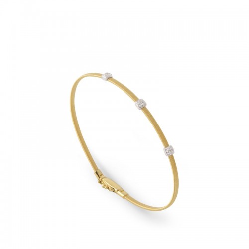 18K small three station diamond bracelet in yellow gold. Inspired by the ornaments typical of the African Masai tribe. Each piece carefully adapts to the curves of the body allowing styles to be worn alone or stacked. Total diamond weight: 0.09ct