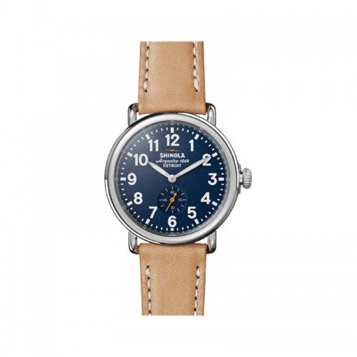 This Runwell 41mm watch features a stainless steel case containing a navy dial with a sub seconds dial, quartz movement, and Arabic numerals on a natural leather strap with a stainless steel ardillon buckle.